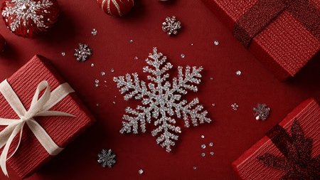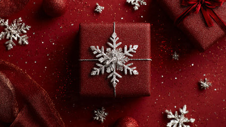 Top-view snowy Christmas setup featuring matte red background and glimmering snowflakes.