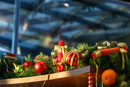 Close up of part of Christmas tree with different christmas toys and garland in shopping center. Coniferous tree with decorative adornments to create festive mood during holiday celebration.