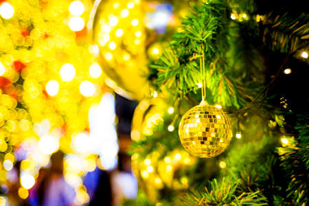 Christmas ball decoration on yellow background. Colorful blur bokeh background. christmas background