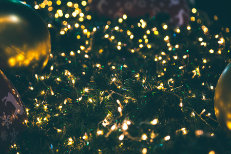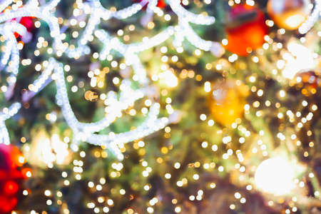 Blurred colorful lights abstract background with christmas tree and ornamental decorations.