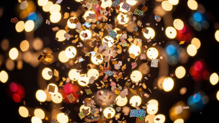 Bright showing a cascade of golden silver and iridescent confetti including stars and circles falling downwards against a soft bokeh background of warm yellow...