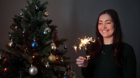 pretty smiling lady in sweater holds bright burning sparkler enjoys holiday standing against christmas tree close view