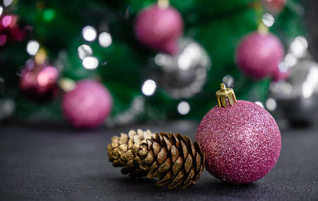 Purple bauble and golden colored pine cone on blurred Christmas lights background. Close up, copy space