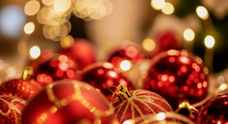 Stacked red and gold Christmas baubles with glitter details and soft bokeh lights. Warm festive still life suitable for holiday advertising and seasonal decor.