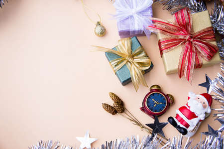 Christmas new year holiday concept. Festive decoration for greeting card with christmas symbols, tree clock star candles. Flat lay top view copy space background