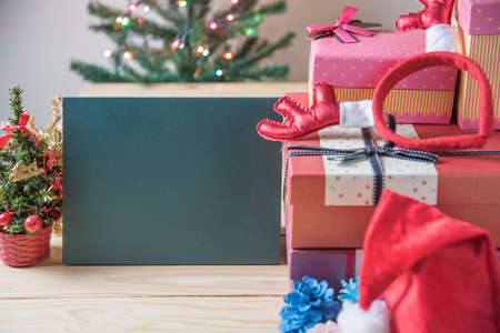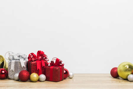 Christmas background with decorations and gift boxes on wooden