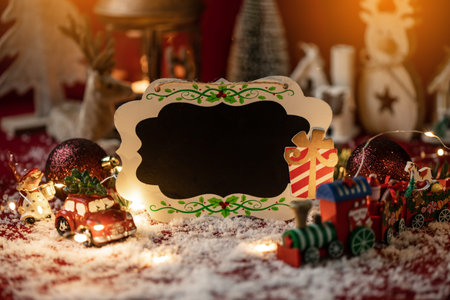 Christmas holiday greeting frame design mockup with decoration on wood table.