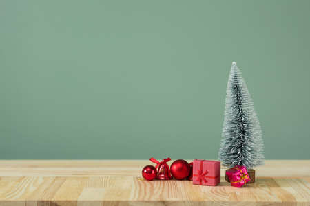 Christmas background. A small Christmas tree and boxes with gifts on a wooden table. Green background. Space for text. New Year's background.