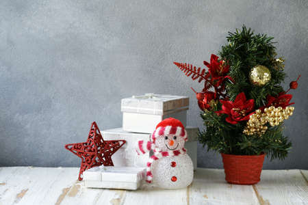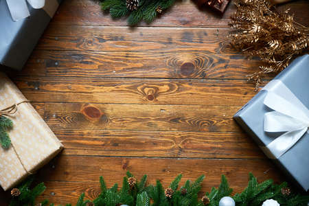 Christmas holiday celebration concept with gift boxes, decoration and pine tree on wooden table copy space