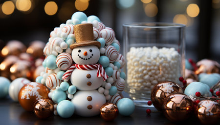 Cozy winter night snowman, gift, Christmas lights, homemade dessert generated by artificial intelligence