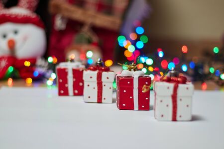 Colorful present boxes on a table over the light wall.