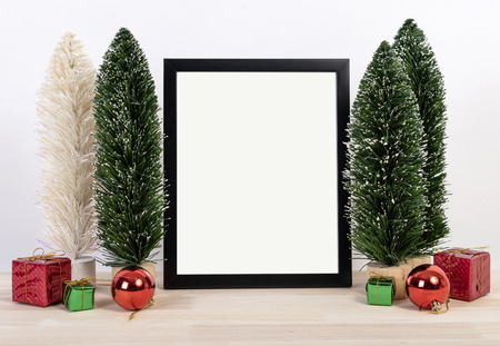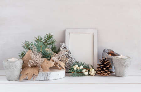 Christmas decoration, frame mockup on a white table, copy space