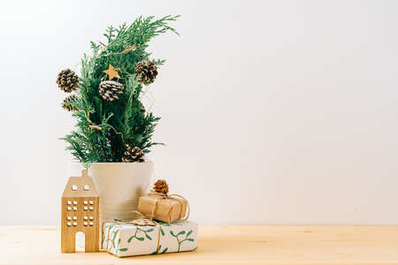 Creative natural miniature Christmas tree in pot on wooden table with gift boxes and white background. Xmas greeting card with copy space. Happy New Year