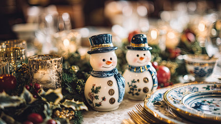 A beautifully arranged holiday table featuring adorable snowman decorations, fine dinnerware, and warm candlelight, perfect for seasonal gatherings and festive meals.