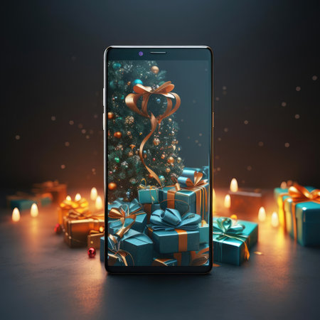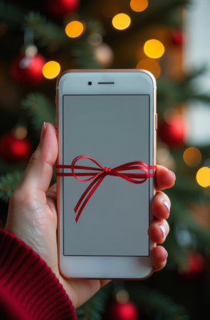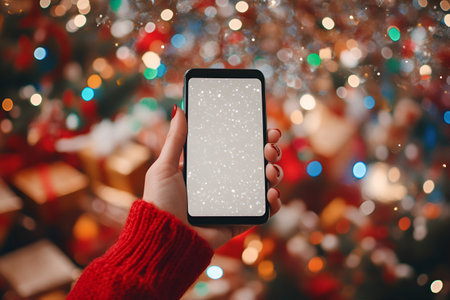A hand holds a smartphone with a blank screen, surrounded by twinkling lights, festive gifts, and a magical Christmas ambiance.