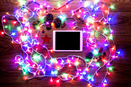 Desk view from above with digital tablet and christmas lights, xmas online shopping concept