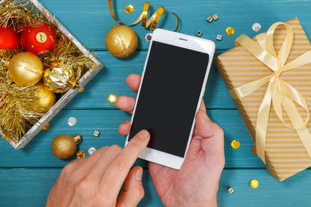 Wooden blue background and golden christmas decorations and smartfon. Men's hands holding a smartphone