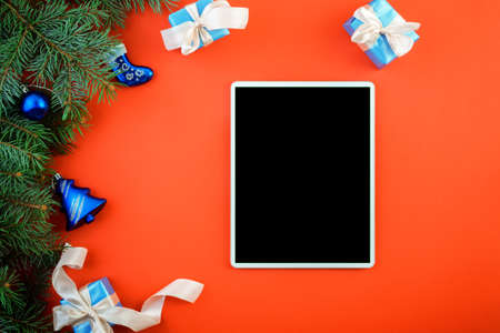 Digital tablet mock up with rustic Christmas decorations for app presentation top view with empty space for you design. Christmas shopping concept. Tablet with copy space on colored background.