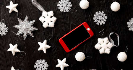 Christmas phone app and holiday message concept. Smartphone with blank black screen and xmas decoration on red background as flat lay mockup design