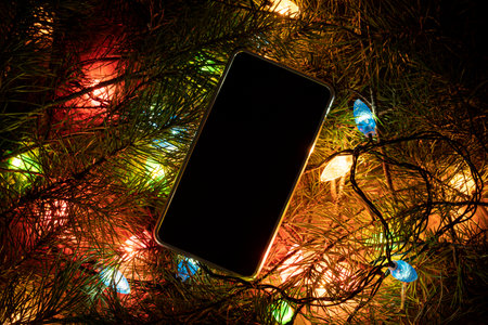 Smartphone surrounded by fir branches. Blank screen for design or text. Christmas decorations and technology concept. smartphone on christmas background