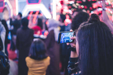 Hand with a smartphone records live music festival and taking photo of concert stage live concert luxury party festival. Blurred effect. colorful light beams neon bokeh