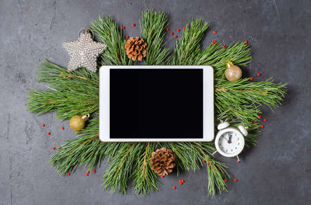 Christmas or new year composition on a dark concrete background. Pine branches and a tablet for greetings.