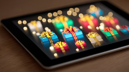 A close-up view of colorful gift boxes adorned with bows displayed on a digital tablet screen, creating a festive and cheerful atmosphere. Soft lights add a cozy touch.