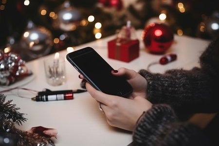 Closeup shot of woman hand holding phone with black blank screen for advertisement or promotional text with christmas tree on background.