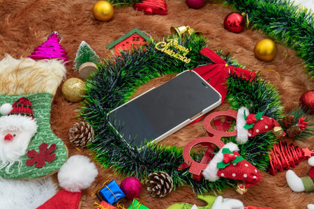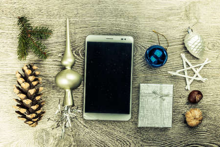 mobile phone in Christmas decorations. mockup cell phone with blank screen in christmas time. Christmas corner with mobile phone