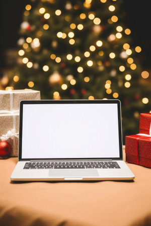 Front view of white screen laptop in home with christmas tree warm light. Remote work. freelance. Work from home. Telework. Copy space