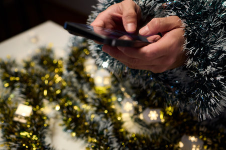 Person using smartphone in a cozy, festive Christmas setting with gifts, lights, and a Christmas tree.
