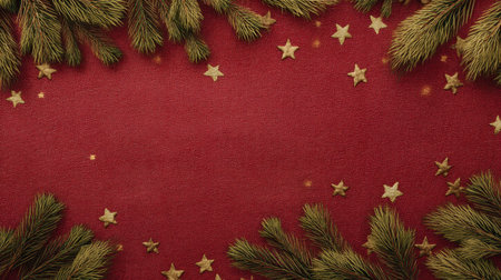 A vibrant red background framed with lush evergreen pine foliage and sparkling golden stars, perfect for Christmas decorations and holiday-themed designs.
