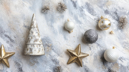 Stylish flat lay of holiday decorations featuring golden and silver stars, a white tree ornament, on a textured light background, perfect for seasonal design inspiration.