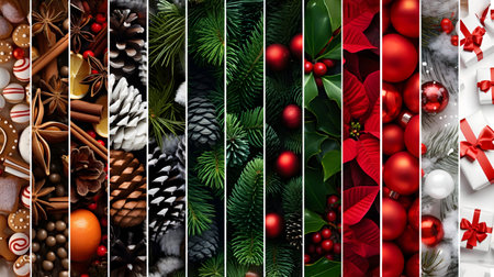 Abstract background with seasonal and winter stripes with plant, leaf, ball, cone, spice, sweets and gifts texture in green, red, white, brown and beige colors. Horizontal composition. Concept of Christmas, holiday and New Year.