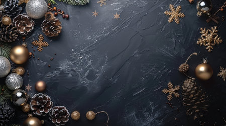 A close-up image of a festive Christmas display with gold and silver ornaments, pine cones, and snowflakes. The ornaments and cones are arranged around the edge of a black textured background, creating a visually appealing and celebratory scene. The image is perfect for holiday-themed projects, social media posts, and marketing materials.