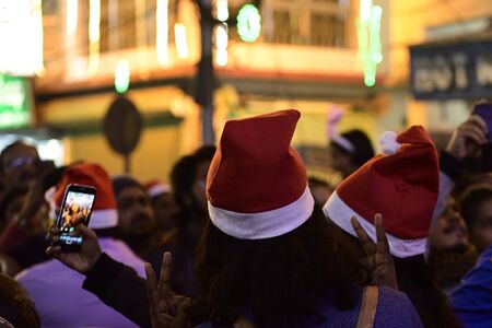 Girls with smart phone photographing Christmas lighting on street at Kolkata.