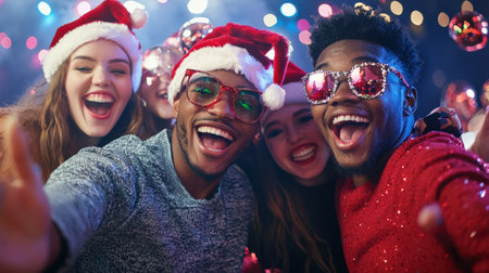A vibrant group of friends celebrates Christmas with joy and laughter. Dressed in colorful festive attire, they create unforgettable moments filled with love and unity.