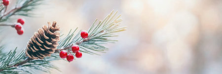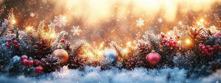 Christmas banner with snowy fir branches, red berries, pine cones, christmas baubles and lights at sunset