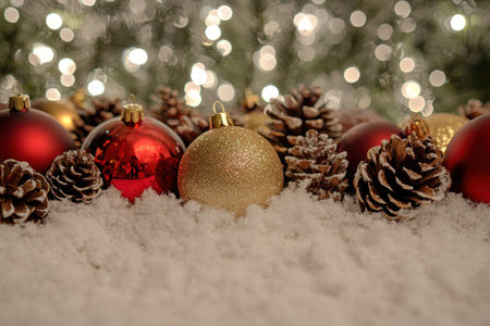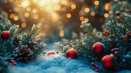 Red Christmas ornaments and pinecones are scattered on soft white snow. Warm, blurred lights twinkle softly in the background, creating a cozy holiday atmosphere.