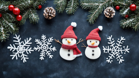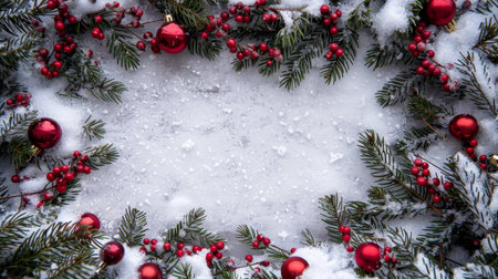 Festive Christmas concept with snow and decoration on rustic flatlay and frame with copyspace