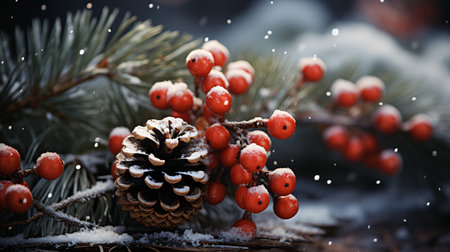 A branch of evergreen trees with red berries and pine cones. The pine cones are covered in snow and the berries are wet. The image has a serene and peaceful mood, with the snow