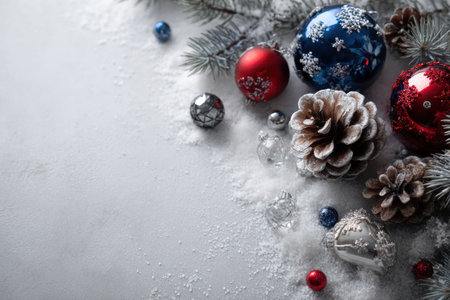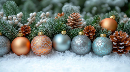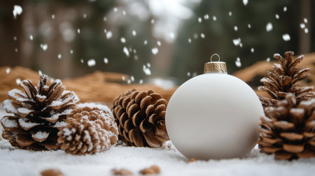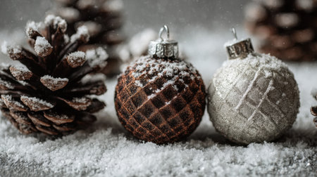 Beautifully arranged Christmas ornaments rest on a snowy surface with pine cones, creating a cozy ambiance perfect for holiday decorations and festive celebrations.