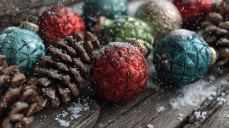 Vibrant Christmas ornaments in red, green, and blue lie among pinecones on a rustic wooden surface, delicately dusted with snowflakes, evoking a festive holiday spirit.