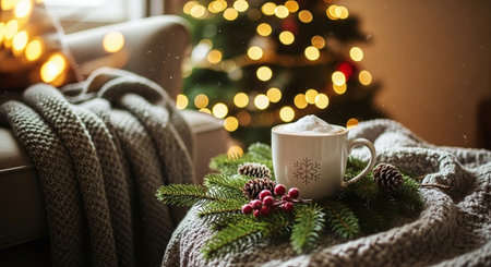 A cozy winter scene with a cup of hot chocolate topped with whipped cream, surrounded by pine branches, berries, and pine cones, with a softly lit christmas tree in the background