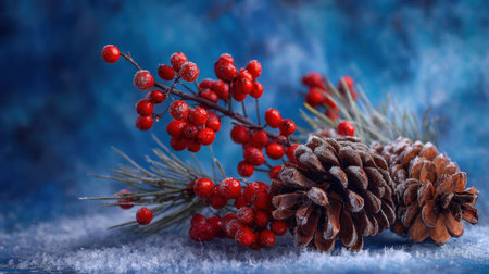 A stunning arrangement of pinecones and bright red berries covered with frost, showcasing a beautiful winter scene. Perfect for seasonal decor and holiday themes.