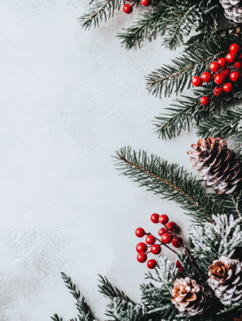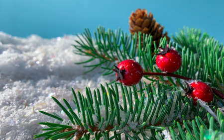 Winter, Holiday, Christmas composition. Fir branches with red berries, cones on a snowy background