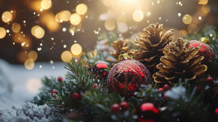 Red Christmas ornaments and golden pinecones nestled in a bed of greenery, with warm bokeh lights and snowfall, creating a cozy and festive holiday scene.