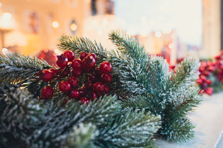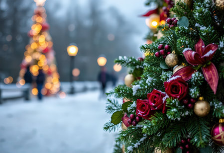 Close-up of Christmas tree with ornaments, with festive street lights in the background. Snow-covered branches and golden decorations. Cozy winter evening.