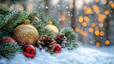 Festive Christmas ornaments, pine cones, and greenery in the snow create a vibrant holiday scene.