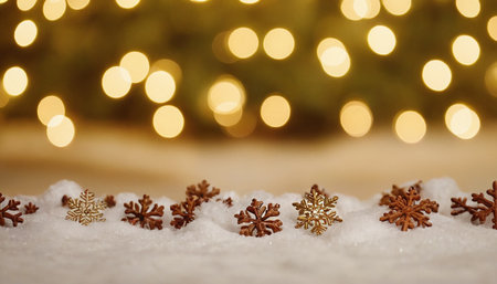 A close-up view of a festive Christmas scene. Delicate golden snowflake decorations are nestled in soft white snow. In the background, blurred golden bokeh lights create a warm and inviting atmosphere. The evokes a sense of cozy winter celebration and holiday cheer, with a focus on the intricate details of the snowflakes and the soft glow of the lights.